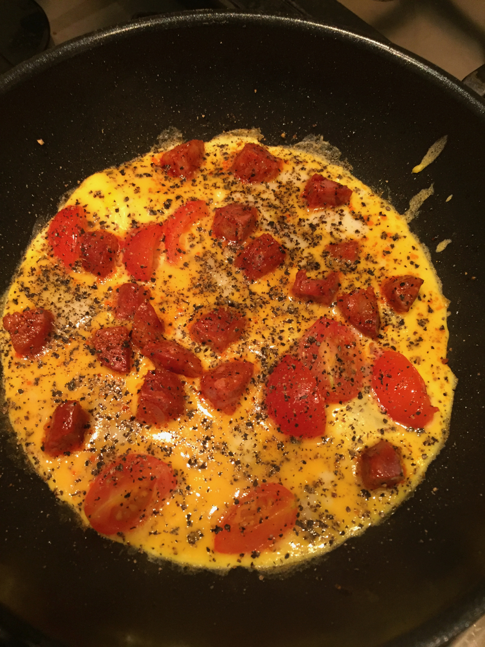 4. Turn the heat to its lowest setting, then add the tomatoes followed by the egg.